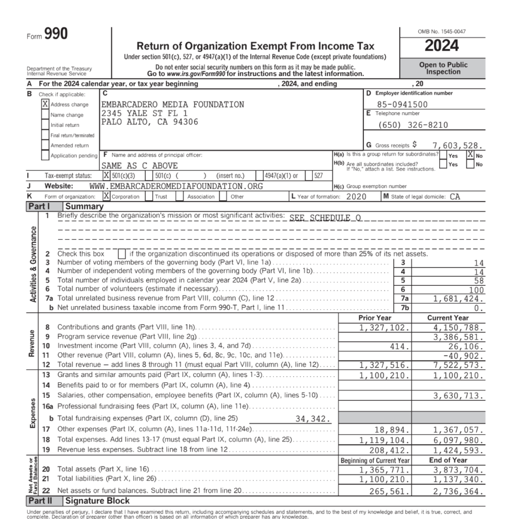 At Embarcadero Media Foundation, we believe in transparency. Here you will find our financial information as required by the Institute for Nonprofit News and federal law.